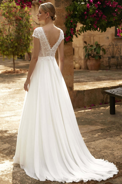 Modèle coup de cœur de chez Bianco Evento avec son décolleté plongeant bordé d’un galon graphique puis d’une guipure moderne jusqu’au bout de ses manches courtes, ce qui lui confère ce côté bohème chic . Cette robe nous évoque également énormément de douceur grâce à son jupon en mousseline tout en fluidité.